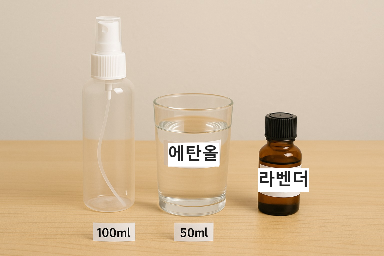 - 재료: 정제수 100ml + 에탄올 50ml + 라벤더 or 시트로넬라 오일 10방울